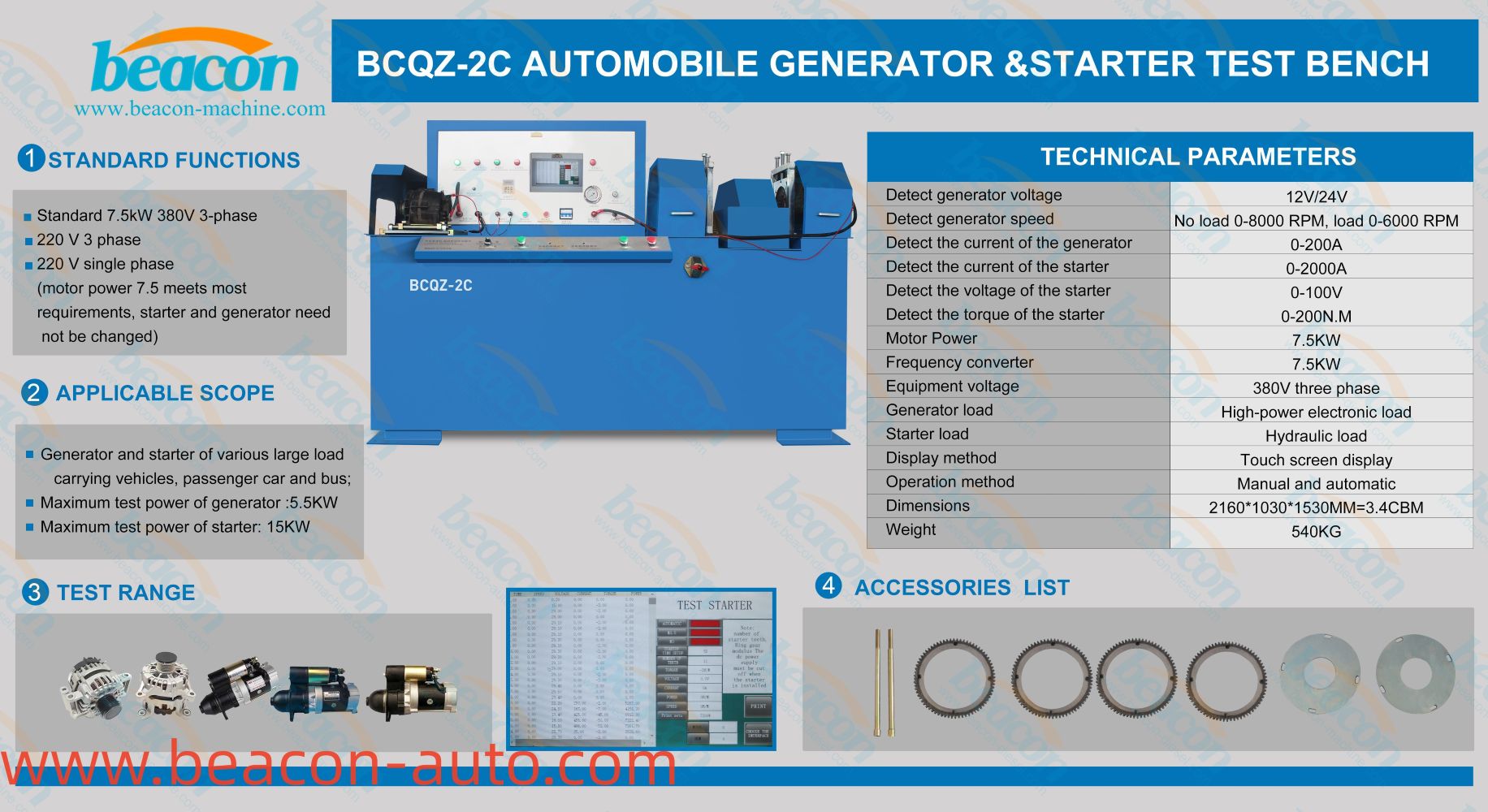 BCQZ-2C starter generator test bench adopts frequency conversion speed regulation, combined with PLC and touch screen control. It is mainly used for performance test of automobile generator and starter, as well as special generator and starter test. The machine has the characteristics of high regulation sensitivity, strong controllability and high degree of automation. The load adopts electronic module type, which is safe and reliable. The touch screen carries out data processing, displays and prints the detection results and waveform curves, and can realize the dynamic detection of various types of generators and starters.